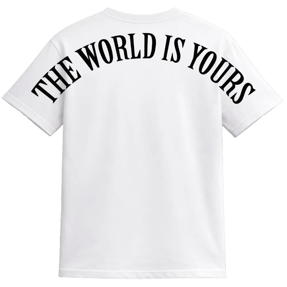 Esta playera blanca con letras negras en la espalda que proclaman «El mundo es tuyo» combina estilo y significado en una prenda. Su diseño limpio y audaz inspira confianza y motivación, convirtiéndola en una opción perfecta para quienes les gusta marcar la diferencia.
